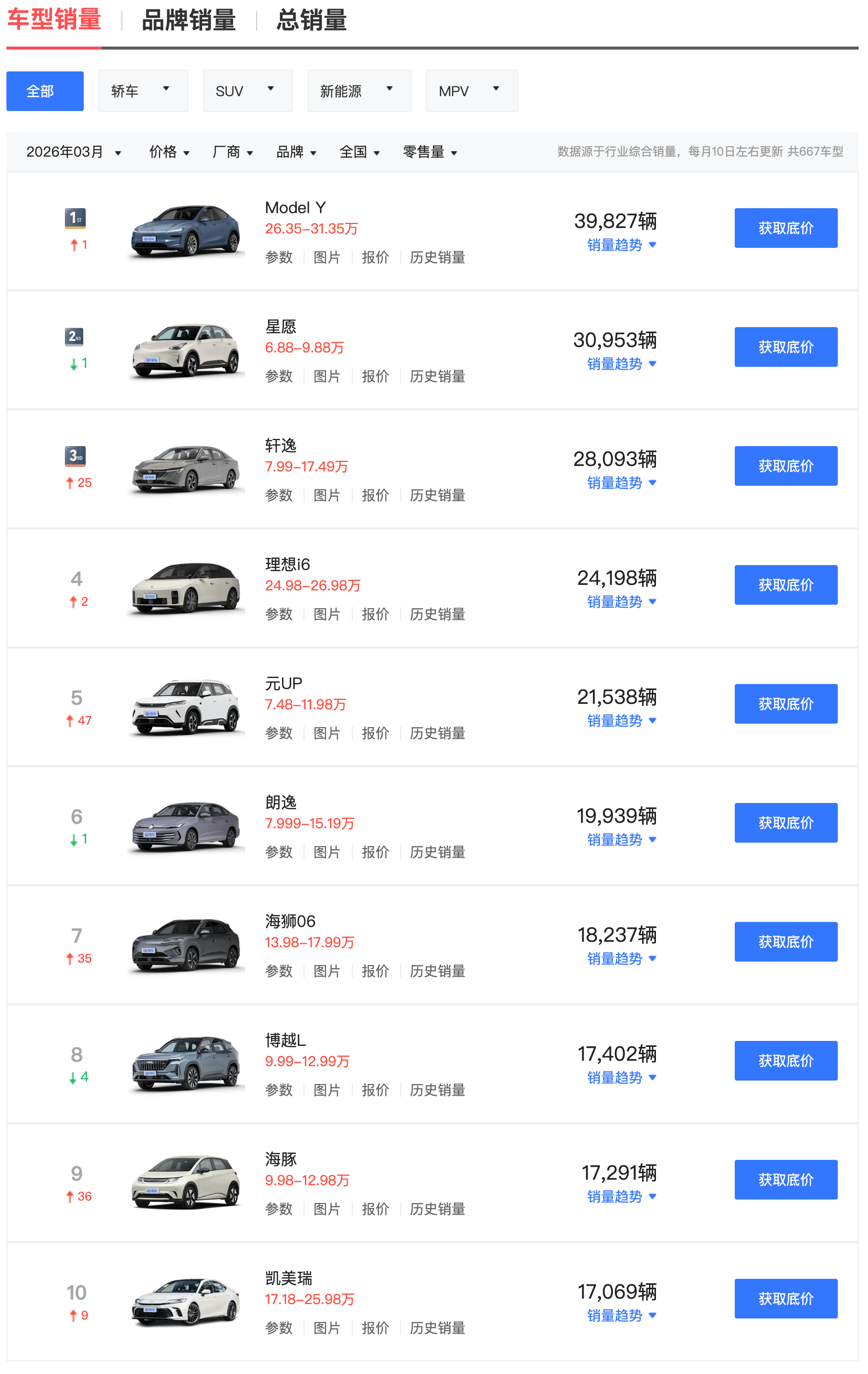 The Model Y is priced between approximately 263,500 and 313,500 yuan, significantly higher than most competing vehicles in the ranking.