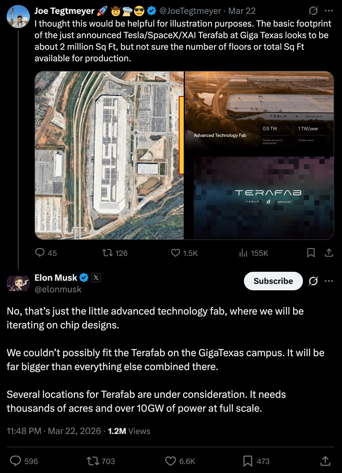 “No, that’s just the little advanced technology fab… We couldn’t possibly fit the Terafab on the Giga Texas campus,” Musk wrote.