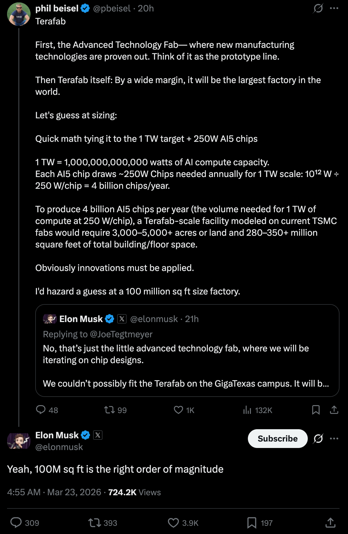 In a post on X, industry observer Phil Beisel provided a rough framework for the scale of the Terafactory.