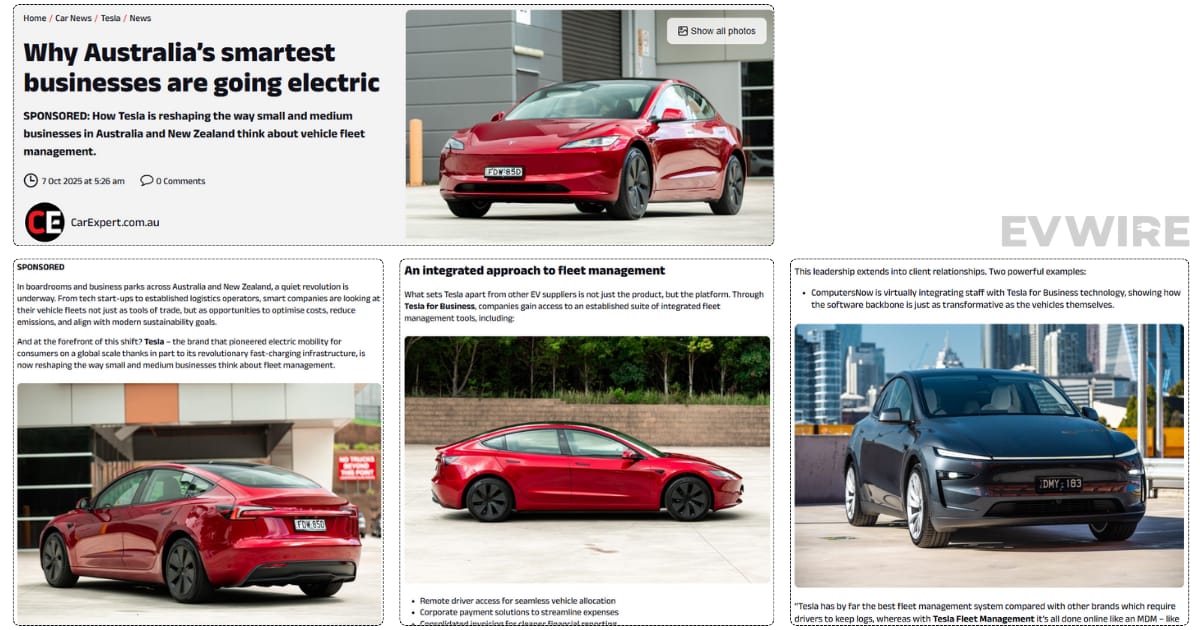 EVWire brief: Tesla is advertising in Australia via a sponsored article on CarExpert that pitches fleet electrification to small and medium businesses. This was also highlighted by Samantha George, the Key Account Manager in the Tesla team working with fleets across Australia. EVwire.com is the first to report on this new advertising form from Tesla, a company notoriously avoiding advertising at large.