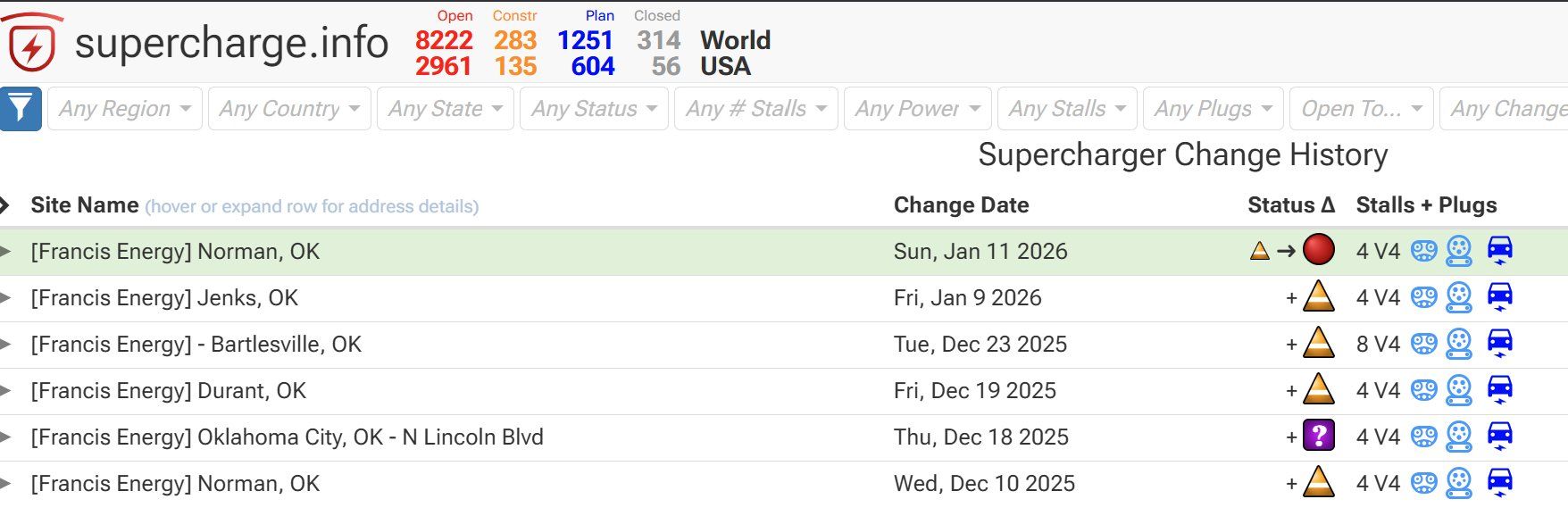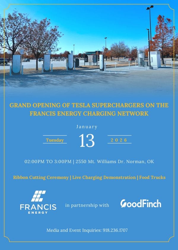EVwire Brief: Francis Energy will hold a (re)opening ceremony for one of their existing sites which now featuresโฆ four Tesla Superchargers. The Norman, Oklahoma site opens on January 13th, and weโve confirmed it wonโt be the last.