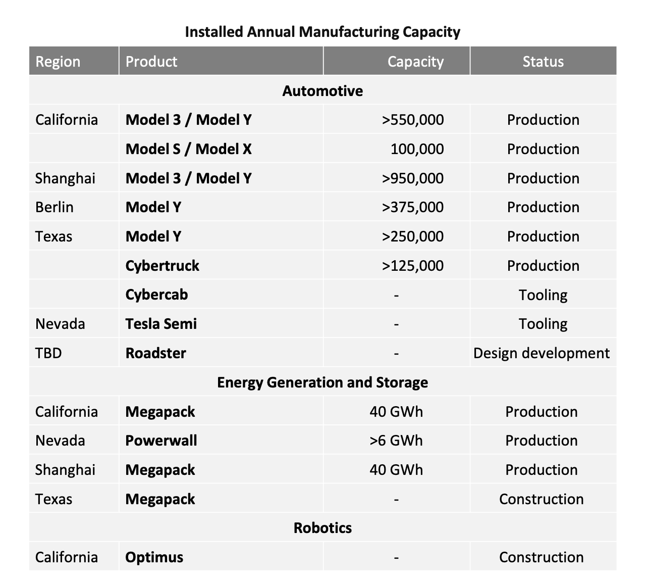 Gigafactory Texas produces the Model Y, the Cybertruck, the Cybercab, and, as per Elon Musk’s previous comments, Optimus. Here’s what the manufacturing capacity looks like per Tesla’s Q4 2025 shareholder deck: