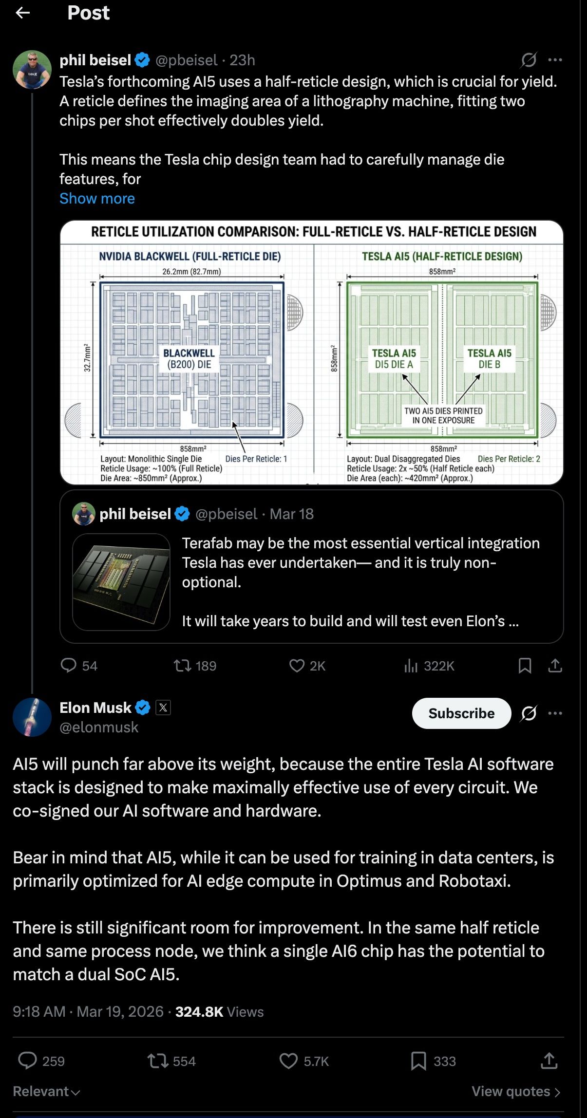 According to Apple and Rivian alumnus Phil Beisel, Tesla’s AI5 chip is expected to use a half-reticle design, which could significantly improve manufacturing efficiency by increasing chip yield compared to larger single-reticle designs.