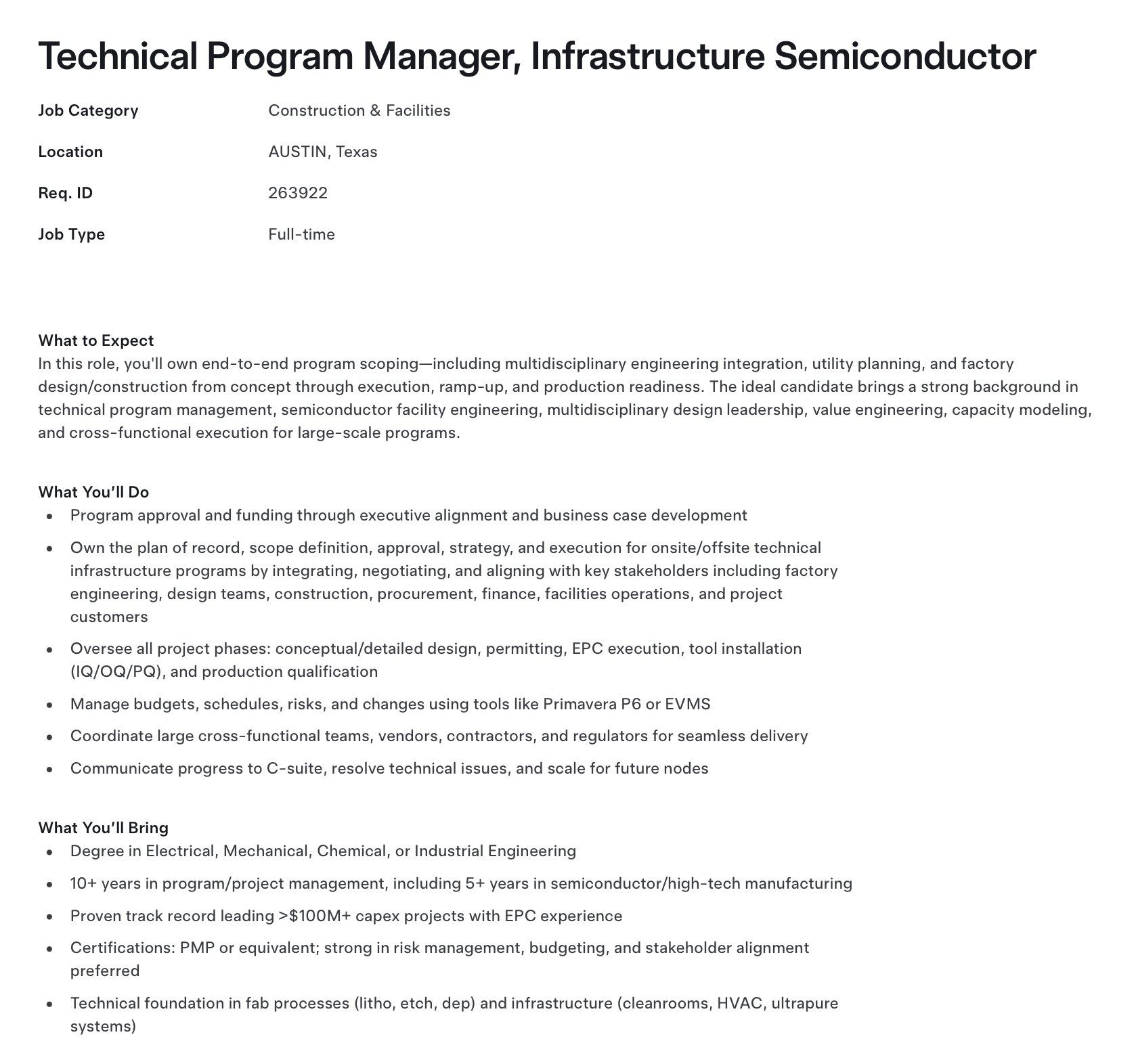 A recent job listing highlighted by industry watcher Sawyer Merritt points to active hiring for a role focused on factory design, construction, and ramp-up for semiconductor manufacturing in Austin.