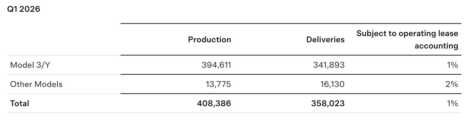 Tesla's Q1 2026 showed a clear recovery from the weak Q1 2025, which was heavily impacted by the major Model Y production changeover. Total vehicle production rose 12.6% year-over-year to 408,386 units in Q1 2026 from 362,615 in Q1 2025, driven mainly by higher Model 3/Y output (394,611 vs 345,454).