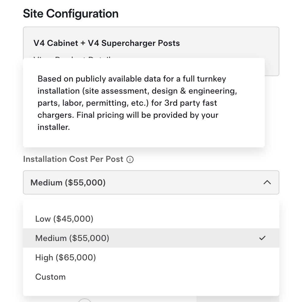The user can choose the estimated installation cost per post from $45k-$65k, as the turnkey installation including site assessment, design & engineering, labor, permitting, etc.