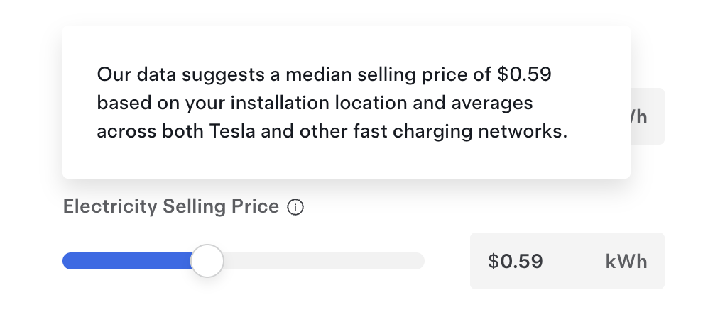 What price should you sell the Supercharging at? Tesla will tell you, showing a median selling price based on the installation location and averages across both Tesla and other DC charging networks: