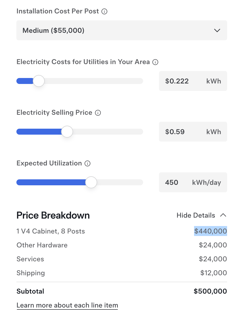 Line 1 says “1 V4 Cabinet, 8 Posts” which incorporates the Installation cost you’ve chosen above (low/medium/high, we went $55k) and multiplies it by the amount of posts chosen (8), for a total of $55k x 8 here, $440k in cost.