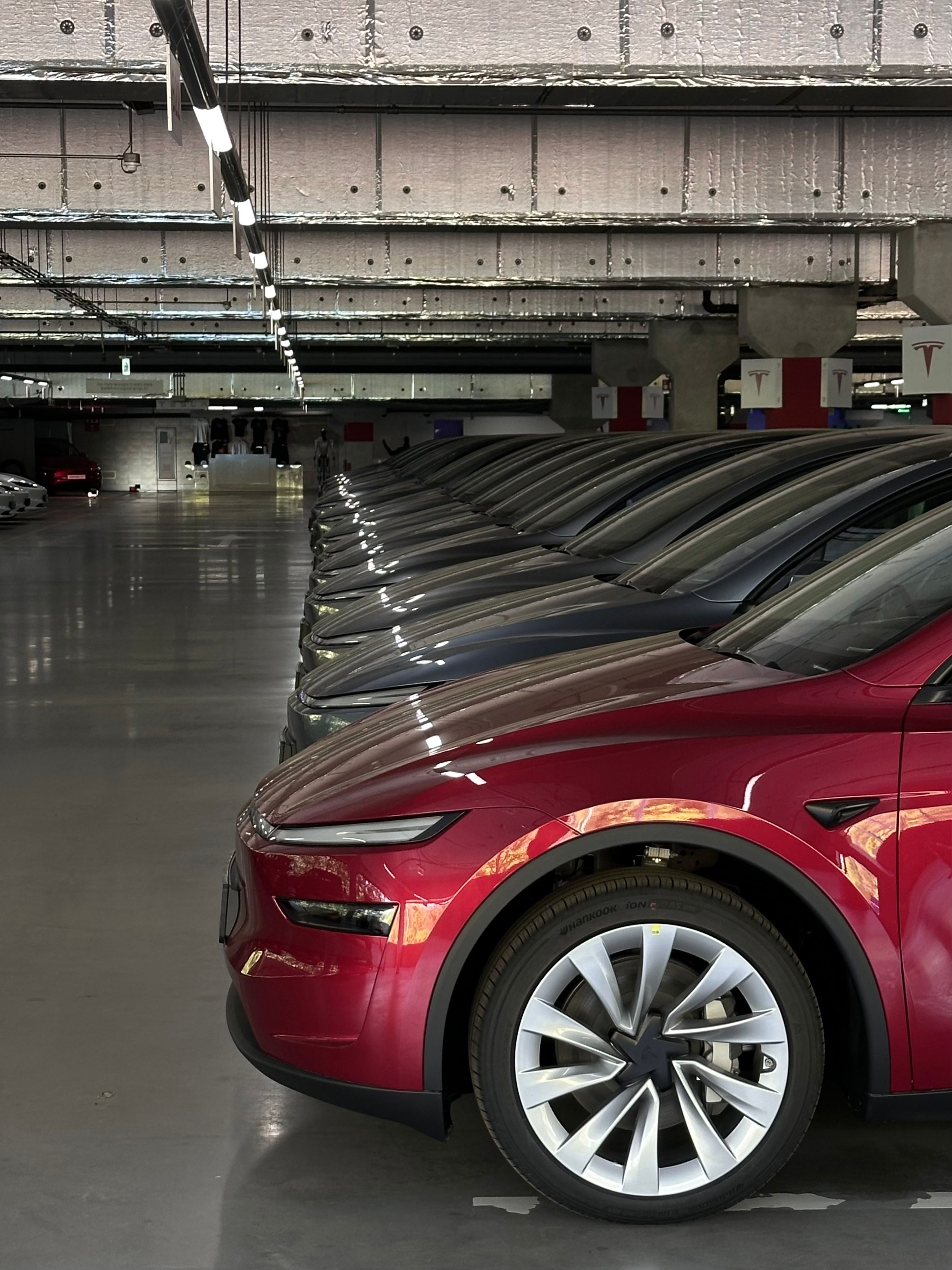 A fleet of Tesla Model Y units is waiting for delivery in South Korea