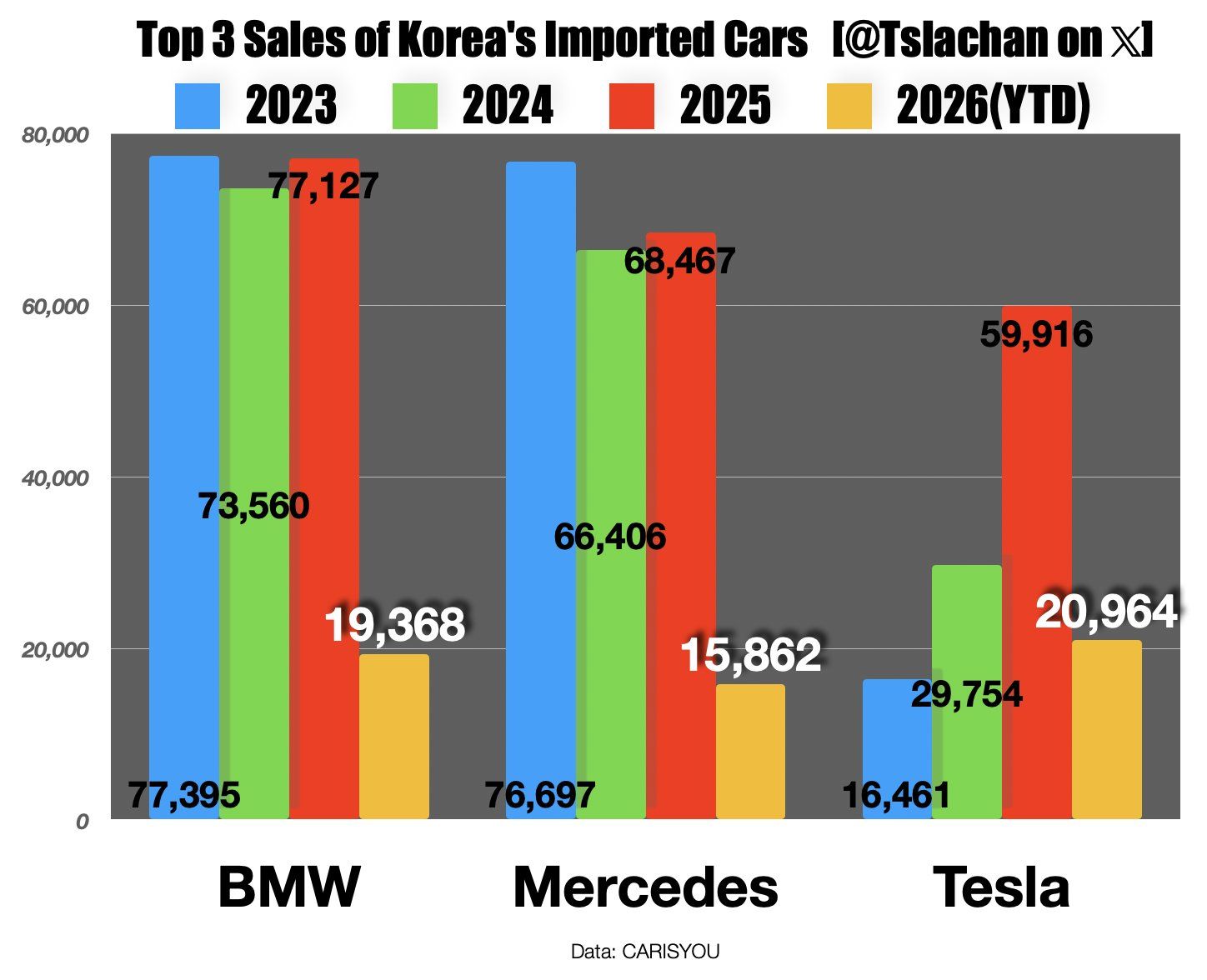 Last year, Tesla finished third (59,916 units) behind Mercedes (68,467) and the reigning champ, BMW (77,127). If Q1 is any indication, the 2026 year-end rankings of South Korea’s imported vehicle market might look different.