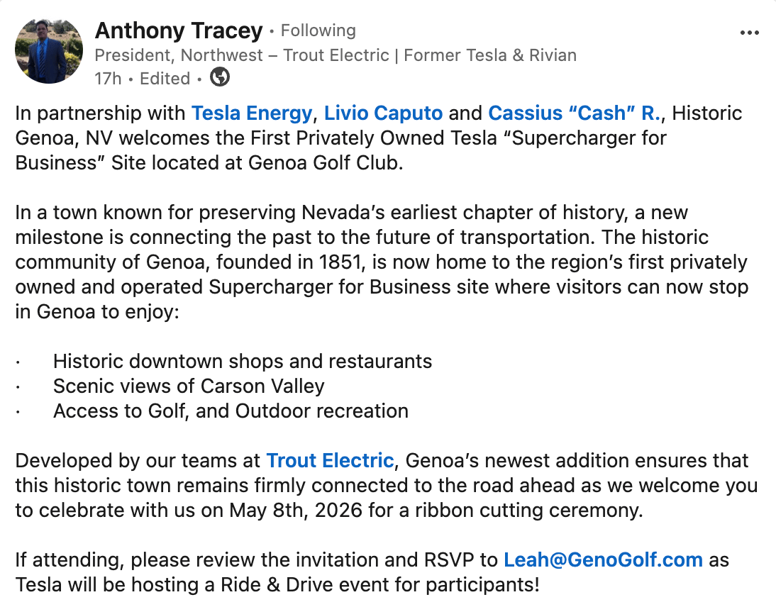 The launch of the new Supercharger for Business site was shared on LinkedIn by Trout Electric President, Northwest Anthony Tracey.