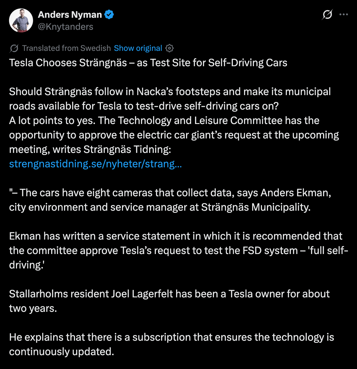The proposal comes from municipal officials, with city environment and service manager Anders Ekman recommending approval for Tesla’s request. The tests would be limited to municipal roads, which are separate from national infrastructure already approved for similar trials.
